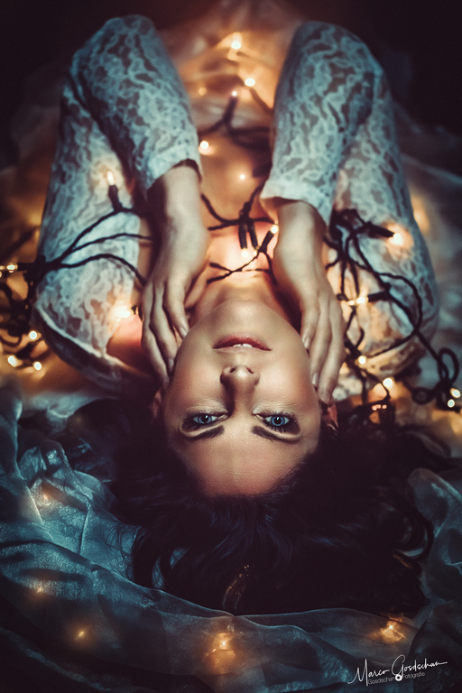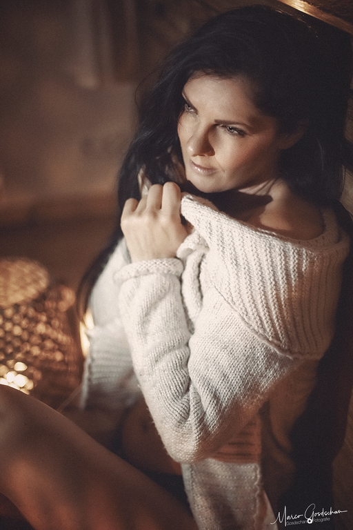 Die wohlige Strickjacke, locker übergeworfen, wurde zum Kontrastprogramm zur Haut – ein Spiel zwischen Schutz und Offenbarung. Die Lichterketten tauchten den Raum in magische Stimmung und ließen sie wirken wie aus einem modernen Märchen. Ein Märchen, das nicht auf Prinzen wartet, sondern in sich selbst glänzt.