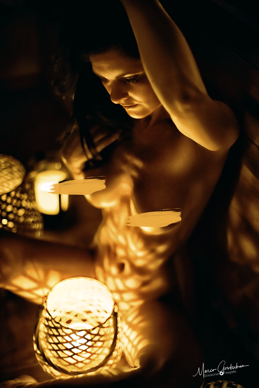 Am stärksten aber wurde es, als das Licht gedimmt wurde. Kerzenschein, warme Schatten, weiches Flackern auf nackter Haut. Der Raum verwandelte sich in ein stilles Bühnenbild, in dem jede Flamme mit ihr zu tanzen schien. Was entstand, war ein Wechselspiel aus Licht und Körper, aus Formen und Emotion. Kein Bild gleich dem anderen, jedes eine neue Facette von Sinnlichkeit – mal zurückgezogen und nachdenklich, dann wieder selbstbewusst, stolz und kraftvoll.