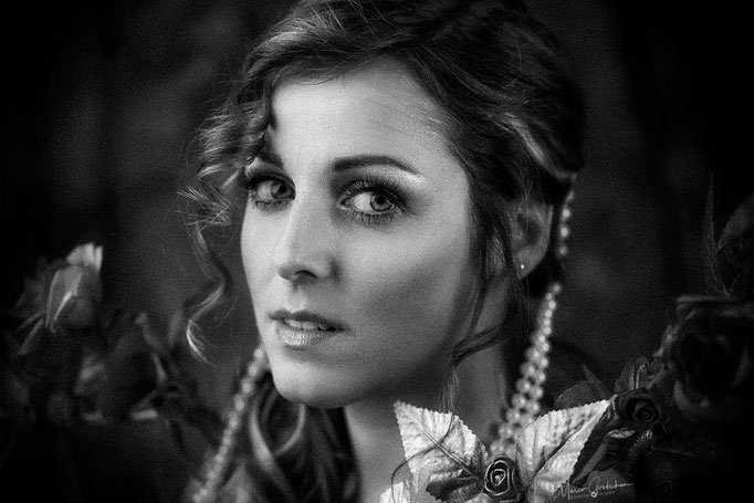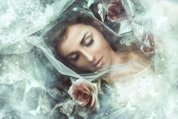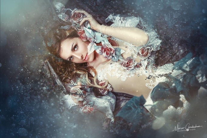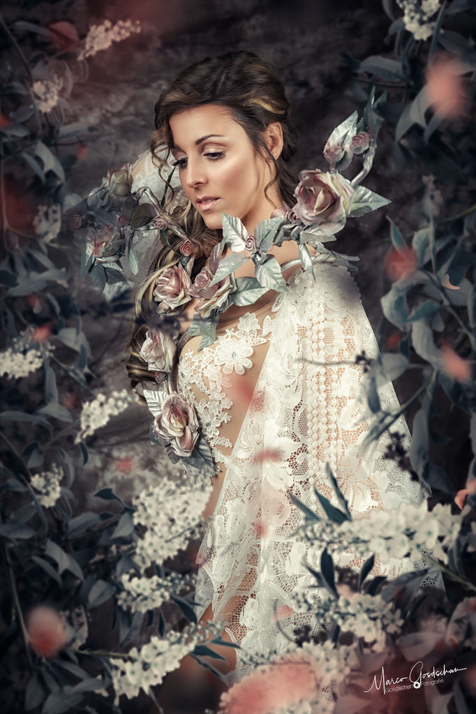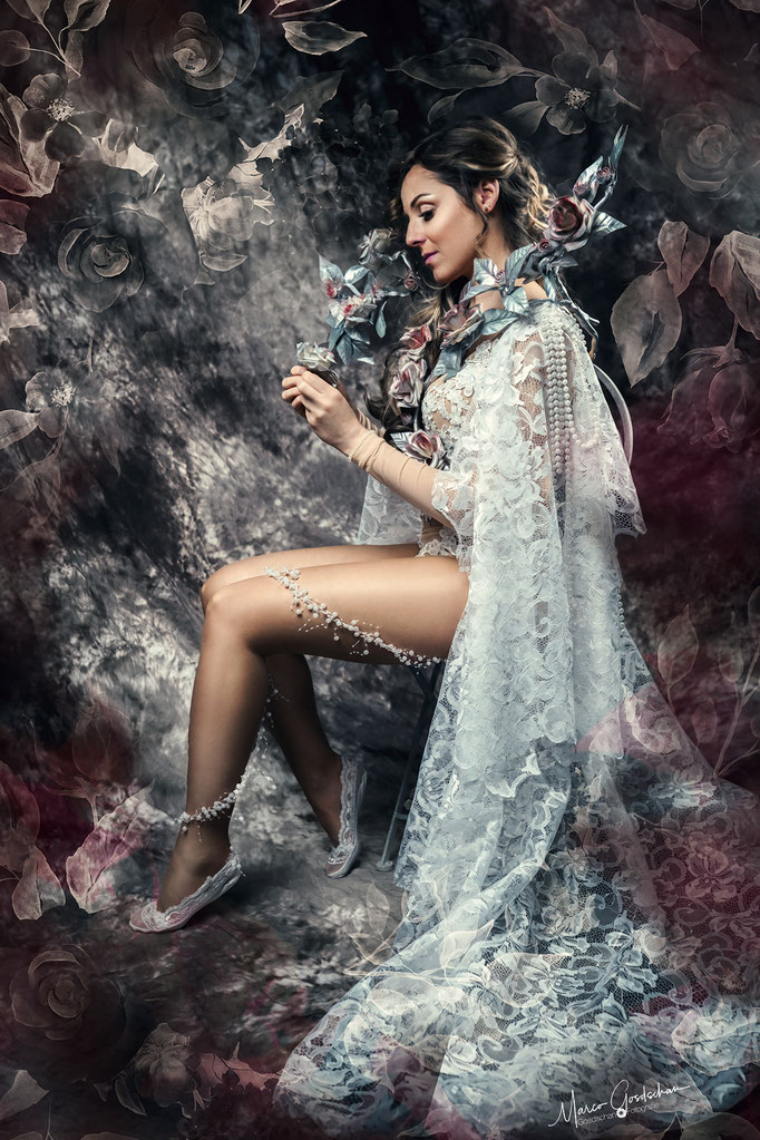 Wenig später stand sie bei mir im Studio. Rein in die Spitze, rein in eine Welt aus Perlen, Rosen und sanftem Licht. Was dann folgte, war kein gewöhnliches Shooting – es war ein visuelles Märchen. Die zarten Stoffe schwebten um sie wie Nebel in einem verwunschenen Garten. Ihr Blick – mal nachdenklich, mal verführerisch, mal verträumt – verschmolz mit der Szenerie.