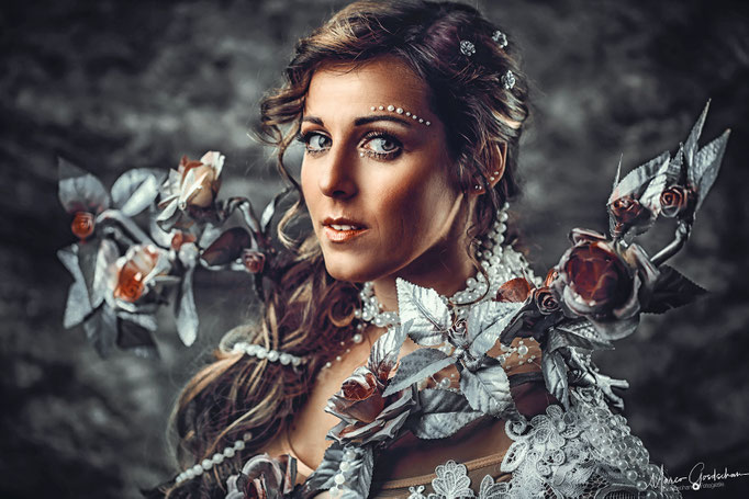 Zwischen floralen Details, metallisch schimmernden Rosen und perlenverzierten Schulterornamenten entstand eine Serie, die für mich weit über ein normales Fotoshooting hinausging. Es wurde leise. Es wurde intensiv. Und vor allem: Es wurde sinnlich.