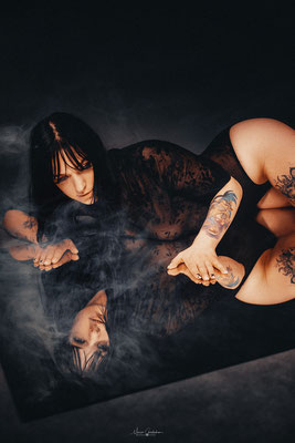 Wir haben uns direkt an mehrere Licht- und Set-Ideen gewagt: angefangen bei mystischen Spiegelbildern mit Rauch, die fast surreal wirkten, über klassisches Low-Key in Schwarzweiß, bis hin zu farbenintensiven Studioaufbauten mit kontrastreichen Color Gels.