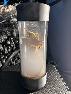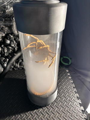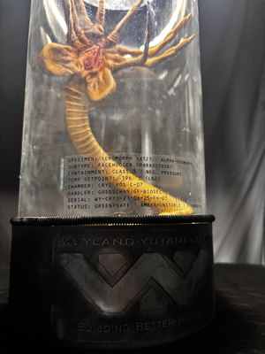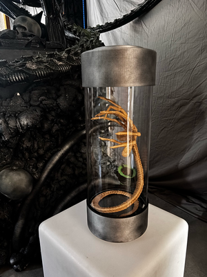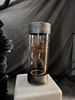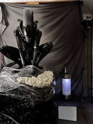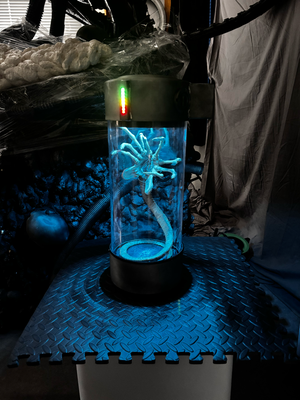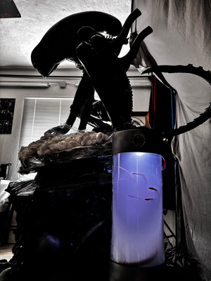 Ein Zylinder, der aus einer Mischung aus 3D-Druck, transparenter Acrylröhre, technischer Spielerei und optischem Stilbruch besteht. Die Basis ist biomechanisch angehaucht, das Oberteil greift den Look industrieller Sci-Fi-Behälter auf – ein Hauch Weyland-Yutani schwingt definitiv mit.