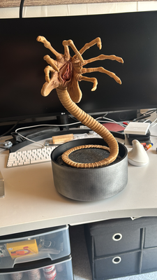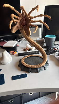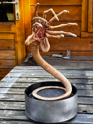 Ich kann gar nicht sagen, wie viel Spaß es gemacht hat, dieses Biest zu bauen. Der Facehugger wirkt in seiner Pose fast elegant – wie eingefroren im Moment des Angriffs. Seine Gliedmaßen sind gespreizt, die Rippenschwanzform zieht sich spiralförmig um den Sockel – und dieser zentrale „Mundbereich“… tja, die Anatomie von H.R. Giger war nie subtil.