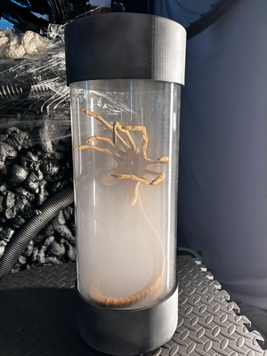 Offenbar habe ich nicht genug damit zu tun, eine lebensgroße Alien-Figur zu bauen – mein neuester Spleen: Ich habe mir einen Facehugger erschaffen. Ja, genau – das schleimige Biest aus „Alien“, das sich mit Vorliebe auf menschliche Gesichter wirft, um seine parasitäre Fracht zu platzieren. Nur dass meiner (noch) ganz brav im Tank sitzt. Noch.
