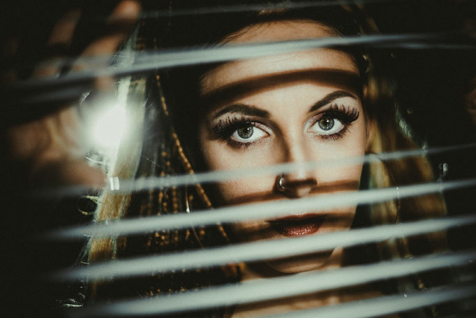 Schon beim ersten Bild war klar: Judy wollte nochmal alles aus diesem Look herausholen. Zwischen den Lamellen der Jalousien hindurch schimmert ihr Blick – neugierig, stark, ein Hauch von Geheimnis. Das Spiel von Licht und Schatten legte sich wie ein Muster über ihr Gesicht, während ihre Hände ganz sanft das Bild öffneten. Es wirkte fast so, als würde sie einen Vorhang zur Vergangenheit beiseiteziehen.