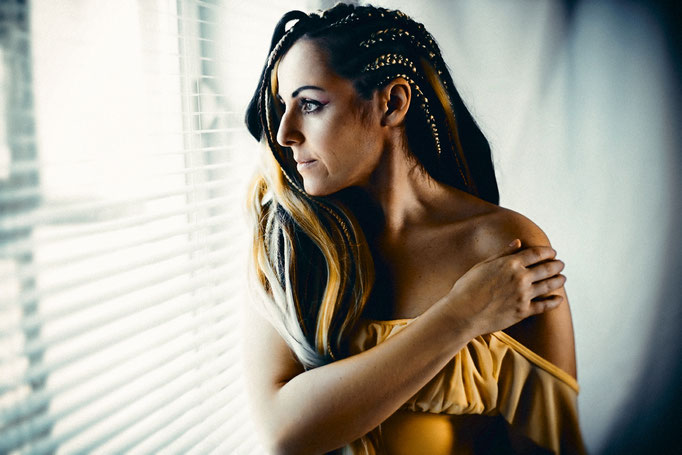 Zum Abschluss entstand eine Serie mit Judy in einem goldgelben Kleid am Fenster. Der Ton des Stoffes harmonierte perfekt mit ihrem Haar, das noch einmal in voller Pracht glänzte. Es war ein letzter Tanz mit dieser Frisur – voller Wärme, Licht und einem Hauch Melancholie.