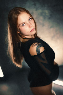 Im letzten Set kehren wir zurück zur schlichten Eleganz. Lea trägt wieder Schwarz, das Licht modelliert ihr Gesicht, lässt den Blick weich wirken, fast verträumt – aber nie naiv. Die Tattoos, die Haltung, ihr Blick über die Schulter: alles erzählt von Stärke und Verletzlichkeit zugleich. Es sind diese Kontraste, die sie als Model so spannend machen. Und die unser gemeinsames Shooting zu einem echten Highlight in meinem Studiojahr gemacht haben.