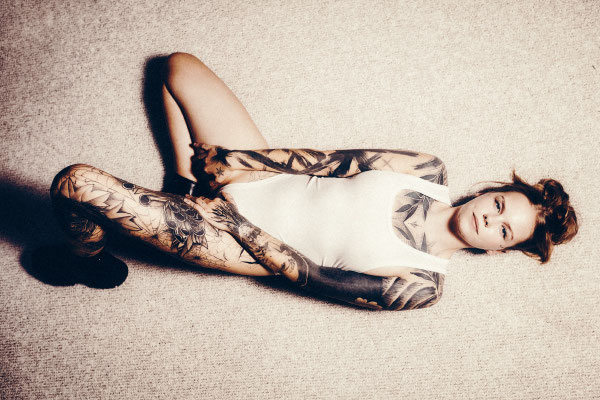 Und plötzlich liegt sie – scheinbar schwerelos – auf hellem Teppichboden. Eine Ruhe durchzieht das Bild, als hätte sich der Raum für einen Moment angehalten. Die Tätowierungen auf ihrer Haut erzählen stumm Geschichten, die von fernem Rauschen, von Pflanzen, Mustern und vielleicht auch Narben berichten. Es ist eines dieser Bilder, bei dem man länger verweilt, weil man es nicht sofort vollständig begreift.