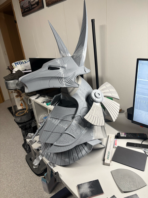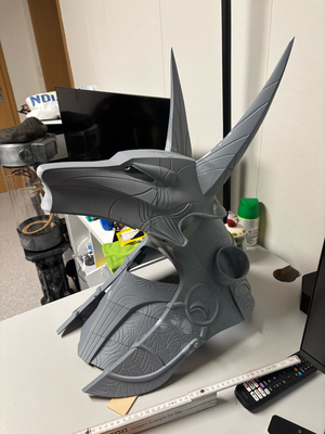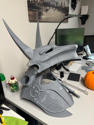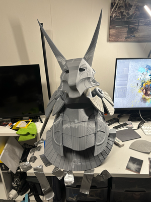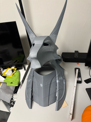 Stunden, Layer und Kaffeebecher später steht da ein Turm aus Teilen, der aussieht, als wolle er eine eigene Postleitzahl. Finale Messung: über 100 cm Maske. Vier Rollen Filament sind dabei heldenhaft durch die heiße Düse marschiert. Wir gedenken in stiller PLA-Minute. (Sie wussten, worauf sie sich eingelassen haben.)