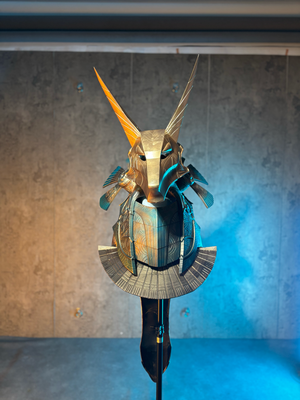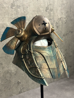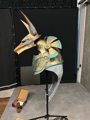 Finish: Grundierung → Schwarz → Goldbronze-Nebel → Klarlack → türkisblaues Airbrush → blau leuchtende Augen.